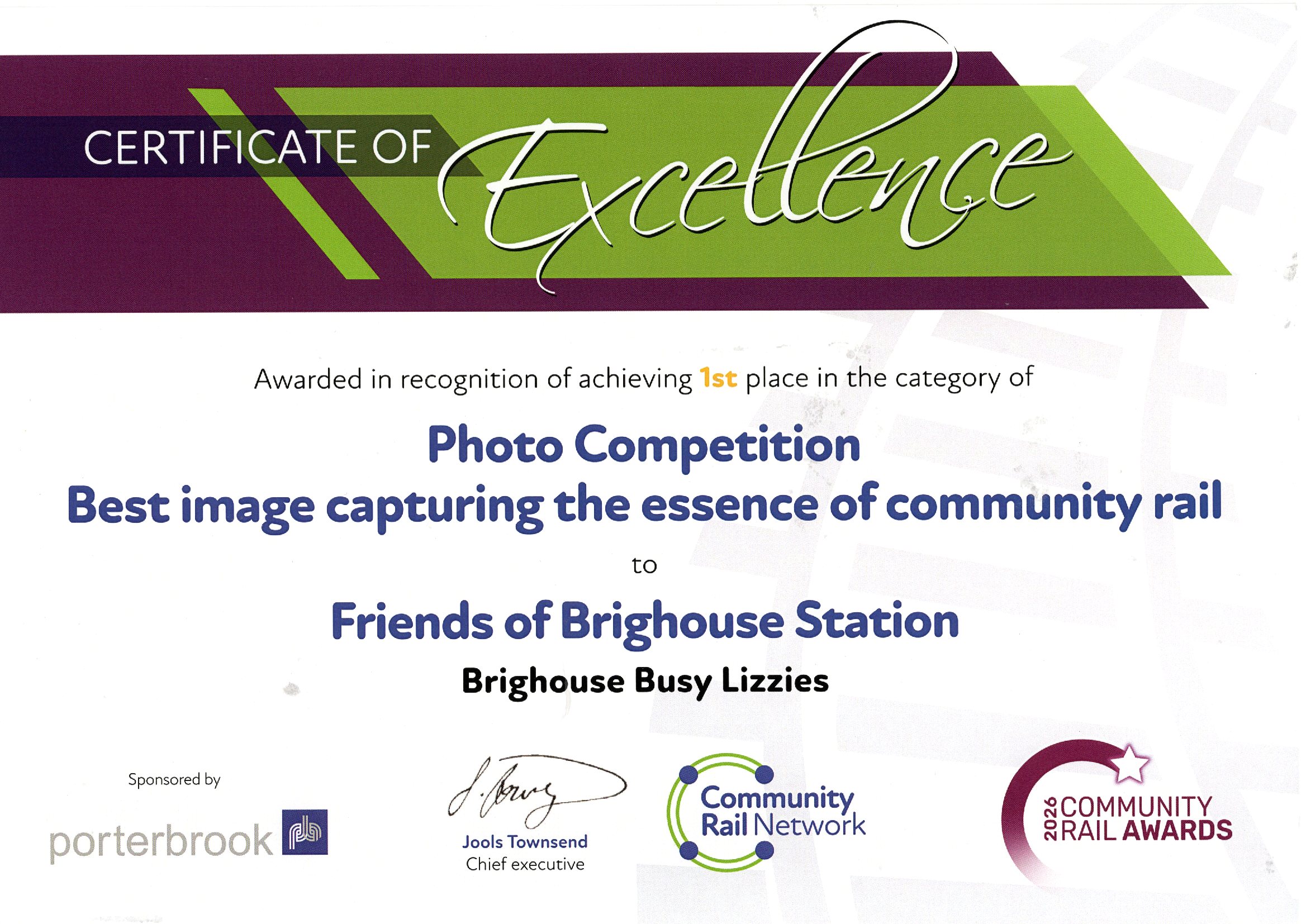 Community Rail Awards 2024 - awarded Certificate of Excellence - Gold level -Top in the country